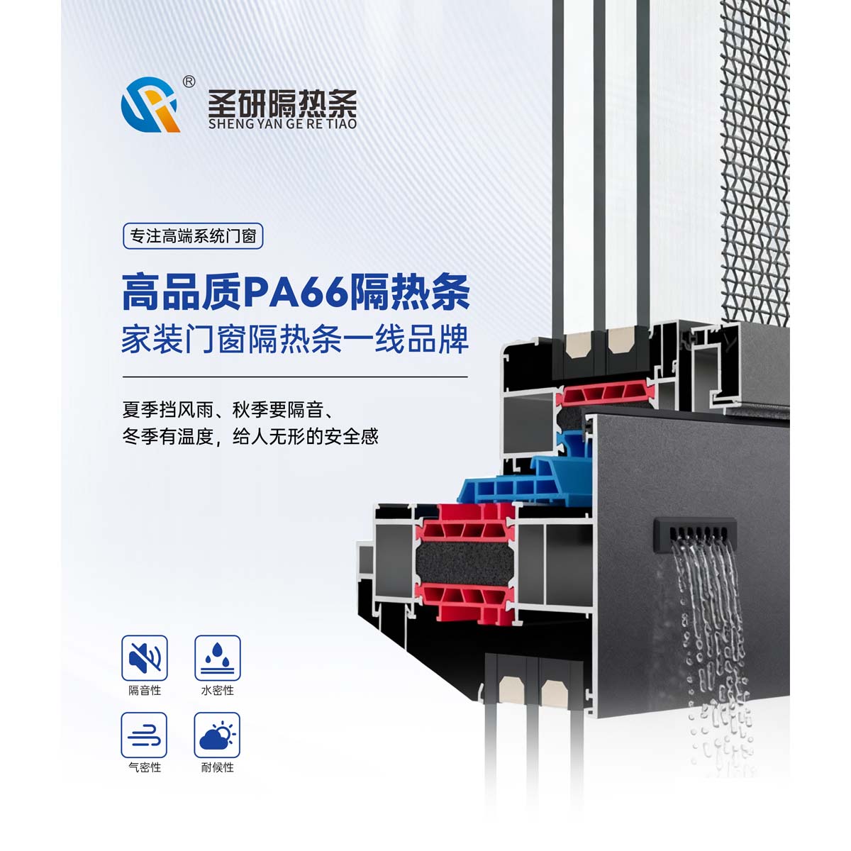 以尼龍66為基材,加入25%得玻璃纖維復合而成,因其具備了較高的機械強度及耐高溫性能,而且可以充分保證其尺寸的精度,保證了隔熱鋁門窗的抗風壓性,氣密性,水密性等基本性能。