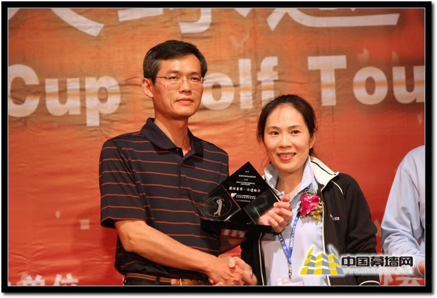 中國建筑金屬結構協會副秘書長 鋁門窗幕墻委員會主任 黃圻先生與女子組冠軍王先平女士合影留念 女子組冠軍,王先平 總桿數 82桿;