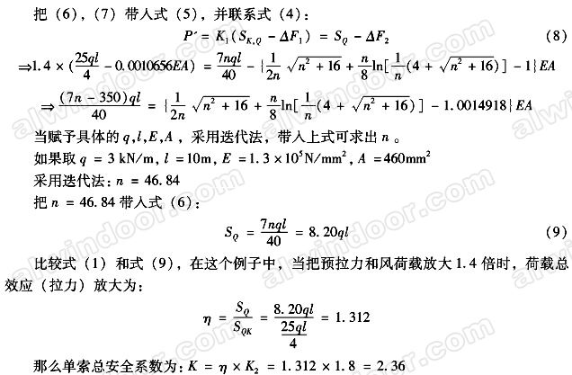由分析結果可知,當采用荷載設計值組合計算單索時,其總安全系數K〕2.36,不滿足《玻璃幕墻工程技術規范》JGJ 102一2003條文說明5.2.5:“單索的安全系數取為 2.5”,實際上是降低了結構的可靠度;可見,預拉力和風荷載放大1.4倍,其拉力并不是線性增加1.4倍,在這個例子中只增加了1.312倍,實際情況是計算單索時很多結構計算人員并未考慮預拉力的分項系數或者考慮很小,比如只考慮預拉力分項系數凡=1. 1,那么單索總的安全系數更小,采用上述推導方法,計算結果大約在2.1左右,這樣就較大的降低了結構的可靠度。