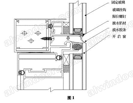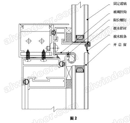 在設計時,往往把安裝披水膠條鋁型材與開啟扇上限位塊做成一體,與幕墻橫梁連接。在圖1中,在限位塊相應位