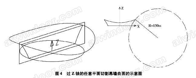 切割幕墻曲面,所得到的切割線都是具有同一的曲率圓弧,在本設計中,取曲率等于150m,如圖4所示。不同的切割線都有相同的曲率半徑,但弧長各不相同。