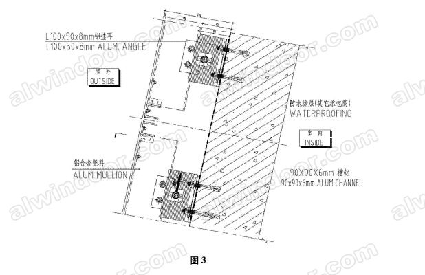 其次,是鋁板接縫的設計。鋁板幕墻接縫采用開放式的節點設計,不需要打膠。幕墻不需要做防水設計,采用土建結構防水。大刁、斜圓錐臺采用混凝土結構,在結構上面先徐上防水涂層,采用90x90x6槽鋁墊上2mm的EPDM橡膠墊片,通過膨脹螺栓固定在結構上作為固定支座。鋁板用90X90X6槽鋁支座來固定,不需要橫梁和立柱(如圖3):鋁單板左右邊各用種焊釘固定一根鋁型材豎料,在豎料的上下兩端各通過2個螺栓固定一個L100x50xgmm鋁掛耳,將鋁掛耳掛裝在槽鋁支座中間的M12x160不銹鋼螺桿上,這樣就將鋁板掛裝在結構外面。裝在槽鋁支座側面上的M6X50mm的螺栓可以在水平方向左右調整鋁板,并起到限位的作用;裝在鋁板上端鋁掛耳的MSx60螺栓可以在高度方向調整鋁板;槽鋁支座上安裝螺桿的孔位在鋁板進出方向開甲17X56的長條孔來調整鋁板進出的距離,從而可以實現連接節點的三維位置可調。