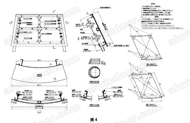 再次,是鋁板工藝。塔樓斜圓錐臺鋁板為不等邊梯形的圓弧板,上下兩條弧邊的半徑不一樣,弧邊所在的平面都平行于水平面,必須提供上下兩條圓弧邊的半徑,弧長和弦長,左右兩條直邊的邊長,左右兩條直邊和上下兩條弧的弦邊組成的梯形的2條對角線長,左右邊與上下兩條弧的弦邊的夾角共4個,及鋁板面相對于水平面的傾斜角度,由于每個數據都要保證精確.