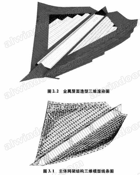 15000多平方米。金屬屋面板整體造型如展翅翱翔的雄鷹,宏偉壯觀,其外形需通過許多三維空間異型的幾何形狀來實現。如圖2.1、2.2。金屬屋面造型在