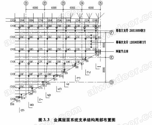 主龍骨,規格為250X150X8鋼方管,其水平投影間距大部分為3米;A~Q軸方向每一板塊分格處布置橫向次龍骨,規格為120X80X5鋼方管,板塊分格原則是將相鄰兩節點球距離4等分。(如圖3,3)
