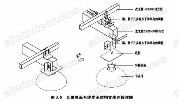 為了方便的調整鋼結構施工時的誤差,主次龍骨相互之間及與主體鋼結構的連接采用了三維可調的支座設計。(如圖3.5)