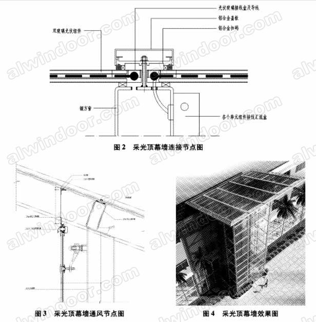 系統(tǒng)設計時,考慮到安全、密封性能、便于維修的實際情況,將雙玻璃光伏組件設計成隱框安裝型式是很好的一種組合形式。也就是將組件的引出線從組件邊緣面通過定制的引線盒引出正、負兩極并配置決速接駁插頭。組件的申、并聯(lián)電纜從隱框結構幕墻骨架的鋁型材的外側面或上下側面白洲曹走線并匯急到各個單元的接線匯流盒配套旁路二極管和防反充二極管,最后各個匯流盒匯總到直流柜完成直流電的輸人。連接完畢后有扣板蓋住并邊緣打密封膠達到隱蔽安裝的目的。這樣既保證了組件連接密封性達到IP65的防水要求,又不影響幕墻屋頂視覺外觀,這是一種比較完善的組合結構。圖2一圖5分別是采光頂設計部分圖片。