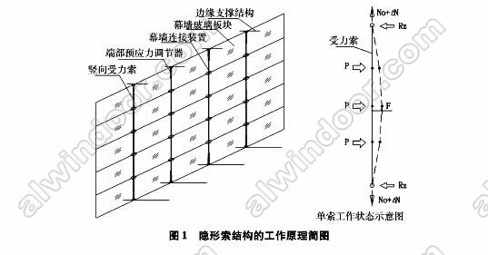 長期以來人們一直期待"視覺上無結構”的玻璃建筑。隱形索結構支承體系是在單向單索結構的基礎上采用了特殊構造措施,即利用了