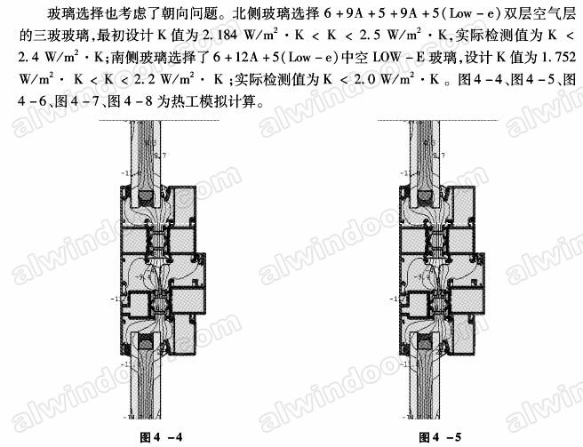 窗墻比24/100,南北立面的外窗面積又大致相同,另外,窗型統一,尺寸、分格、開啟形式完全一樣。如圖4一3所示。由于幾乎處于正南和正北朝向,北立面緊鄰北京市北三環主干道,主樓北立面臨三環輔路邊緣僅30米,北立面強調保溫的同時,噪音隔離是一個重要問題。南立面面臨2層辦公樓和家屬區。綜合考慮后,窗系統保待一致的情況下,北立面玻璃選擇為,南立面選擇。后根據檢測結果:北側雙中空鋁合金隔聲性能.Aw=36-2-5)dB;南側單中空鋁合金窗隔聲性能:Rw=34-1-3)dB