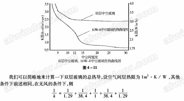 中空玻璃或雙層玻璃的特征是在兩層玻璃之間形成一個空氣間層,和其他空氣間層一樣,它可以阻止熱量的通過。中空玻璃中的空氣間層相對雙層玻璃來講密封性要好,但值都會隨空氣層厚度的增加趨于穩定。見圖4-11