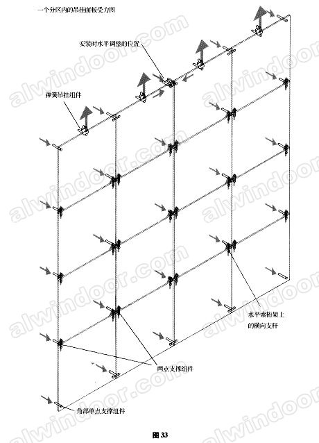 玻璃懸吊系統(tǒng)包括四種不同的支承系統(tǒng):一方面是彈簧支承裝配組件,另一方面是分別用玻璃板角部一個(gè)、兩個(gè)或四個(gè)連接裝置。圖33