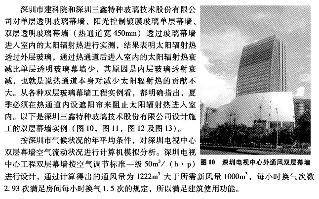 深圳電視中心雙層幕墻的設計,為一種敞開式雙層幕墻通風結構,旨在克服現有技術的通風結構中結構復雜、成本高的不足,提供了一種敞開式進、排氣口的通風結構。深圳電視中心雙層幕墻的通風結構可在熱帶或亞熱帶地區的建筑物中推廣使用。