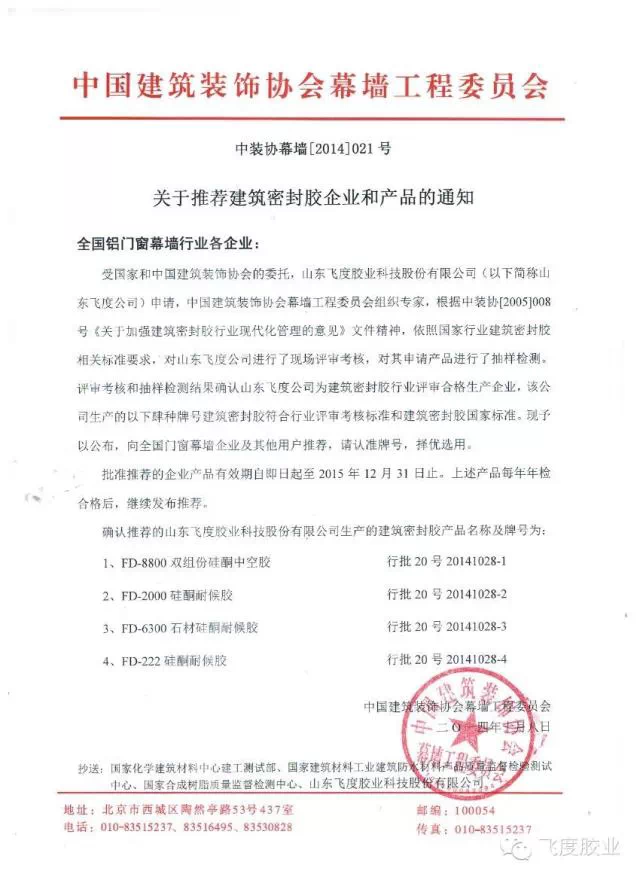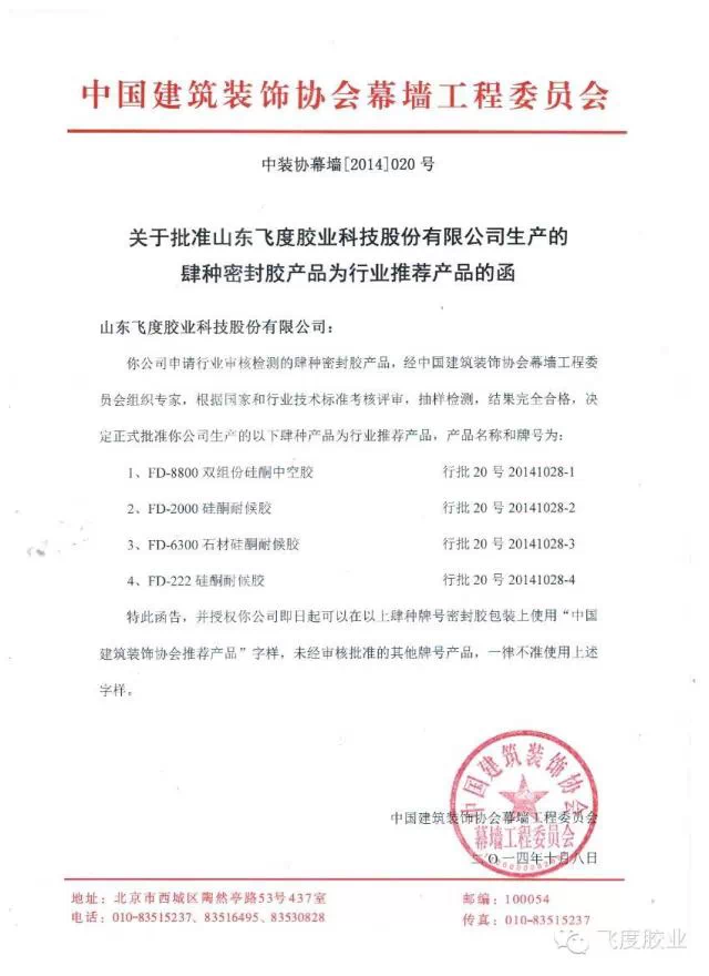 同時,10月8日,中國建筑裝飾協會幕墻工程委員會發布《關于推薦建筑密封膠企業和產品的通知》(中裝協幕墻[2014] 021號),通過評審考核和抽樣檢測,確認山東飛度膠業科技股份有限公司為建筑密封膠行業評審合格生產企業,飛度膠業生產的FD-8800雙組份硅酮中空膠(行批20號20141028-1)、FD-2000硅酮耐候膠(行批20號20141028-2)、FD-6300石材硅酮耐候膠(詞條“耐候膠”由行業大百科提供)(行批20號20141028-3)、FD-22硅酮耐候膠(行批20號20141028-4)為中國建筑裝飾協會行業推薦產品。