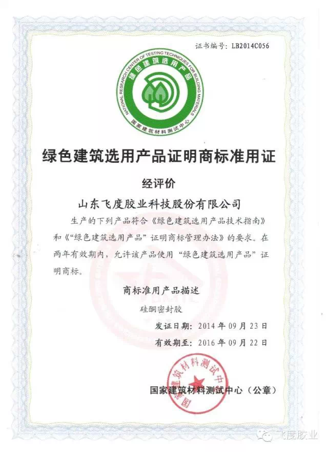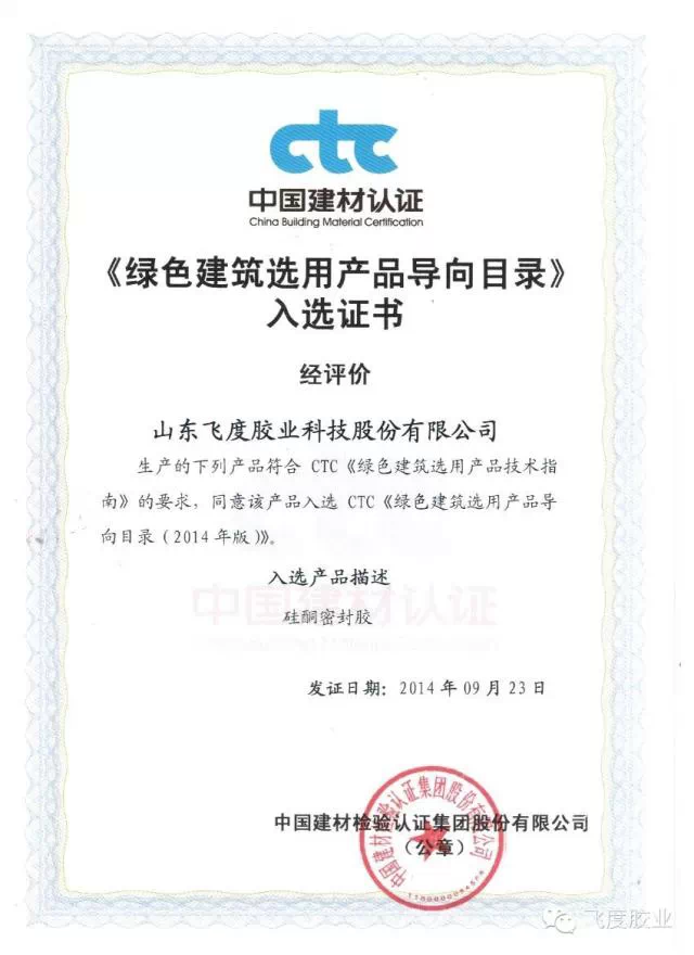 2014年9月25日,中國建筑金屬結構協會鋁門窗(詞條“門窗”由行業大百科提供)幕墻委員會發布《關于批準硅酮結構密封膠(詞條“硅酮結構密封膠”由行業大百科提供)產品認定的通知》(中建金膠字[2014]第010號),山東飛度膠業科技股份有限公司為受認定企業之一。公司認定產品"FD-9900雙組分建筑用硅酮結構密封膠"和"FD-6000建筑用硅酮結構密封膠"成為建筑用硅酮結構密封膠行業年度推薦產品,認定序號分別為:認定行膠管010號內認定字20140925-175 和 認定字20140925-176。