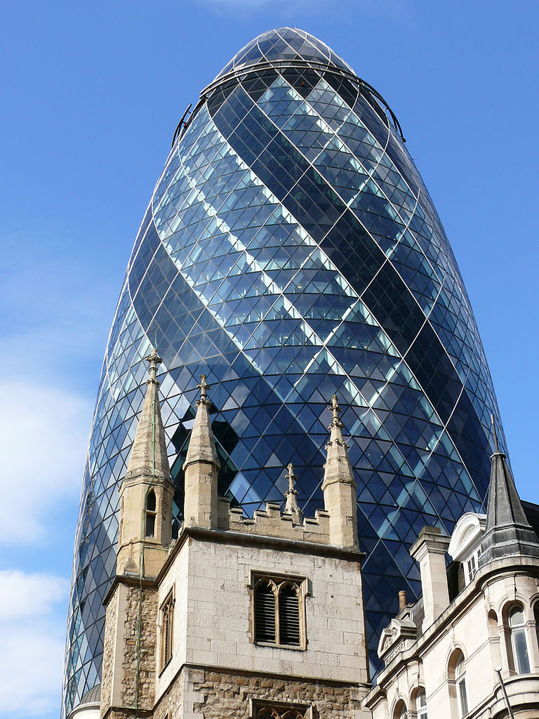 “腌黃瓜”,位于倫敦圣瑪麗阿克斯大街30號的瑞士再保險總部大樓,高179.8m,樓層50 層,螺旋式外觀,獲得2004年的RIBA斯特林大獎,被譽為21世紀倫敦街頭最佳建筑之一。是一座十分杰出的建筑物,不但外型優雅,而且講求高科技與環保,可說是未來建筑的典范。