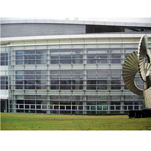 在外立面方面,橢圓形的造型簡潔干練,兩側入口前廳的書卷形中庭空間層層收進對橢圓形體進行完美的切割雕琢,外幕墻以金屬裝飾板和玻璃幕墻為設計元素,幕墻面積約32000平方米,造價約3000萬元。外皮通過金屬裝飾板和玻璃幕墻的對比做到虛實結合,外挑橫向金屬裝飾板有序的錯落變化更好地凸顯出主體建筑橫向脈絡的肌理,其靈動的質感和流暢的現代感,俯瞰之下,就像一只充滿智慧的眼睛。