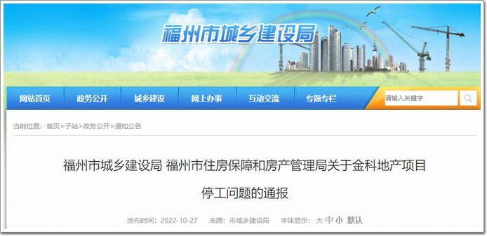 福州市城鄉(xiāng)建設局 福州市住房保障和房產(chǎn)管理局關(guān)于金科地產(chǎn)項目停工問題的通報