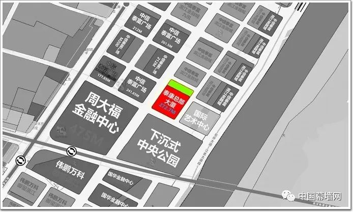 項目位于武漢市中心漢口國際濱江商務區核心區,毗鄰解放大道、沿江大道,與即將刷新武漢天際線的周大福金融中心和中信泰富濱江金融城等知名建筑為鄰,是集5A智能化寫字樓、五星酒店、酒店式服務公寓及配套商業于一體的垂直城市綜合體。