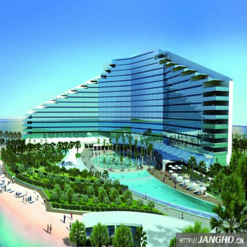 珠海橫琴國際金融中心共15個幕墻系統, 其中13個在裙樓位置。該裙樓幕墻系統包括:首層EWS 4系統大堂為隱框玻璃幕墻(詞條“隱框玻璃幕墻”由行業大百科提供);EWS 10、12系統為隱框玻璃幕墻;EWS 11系統為開放式鋁板幕墻;三層EWS 7系統為鋼龍骨(詞條“龍骨”由行業大百科提供)豎明橫隱玻璃幕墻;四~八層室內中庭EWS 16系統為豎明橫隱玻璃幕墻;貫穿全部裙樓的EWS 3/5/8系統為鋼龍骨特異板塊規格結合裝飾線條的玻璃(含采光頂)、鋁板幕墻;貫穿全部裙樓的EWS 6/9系統為分離式金屬屋面;EWS 13系統為開放式銅板幕墻和夾板式結構幕墻;EWS 14系統為鋁百葉吊頂幕墻。另外還有下沉廣場玻璃、鋁板幕墻、各層間玻璃欄桿等、玻璃地彈門、旋轉門、鋁板門、格柵門等,各類幕墻系統總面積約3.5萬平方米(圖4)。