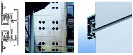 “構件式幕墻單元化”的原理非常簡單,即在不改變構件式幕墻基本構造的前提下,通過定位、約束,將構件式幕墻的零件在地面拼裝成單元,然后整體安裝。在這種思路的指導下,各種線條、造型類特殊構件都可以很容易地“單元化”,如圖1的鋁板飄檐、圖2的鋁板造型。