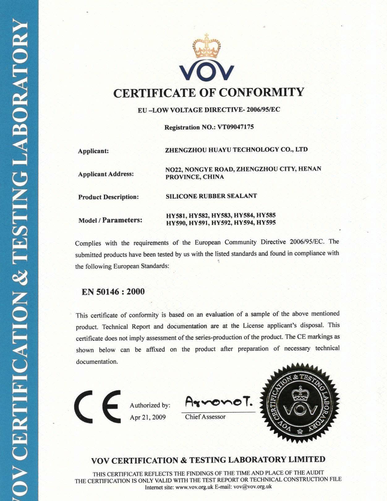 頒發機構: VOVCERTIFICATION & TESTING LABORATORY LIMITED
