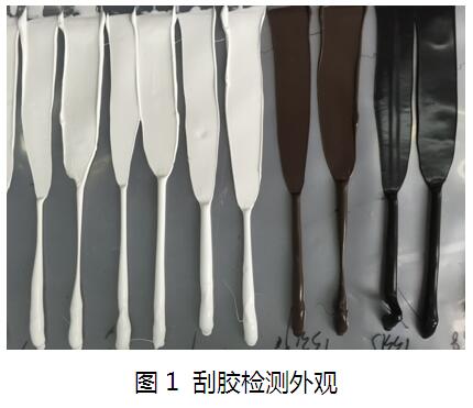 把膠打成膠條,立即進(jìn)行刮膠,觀察外觀(如圖1)。刮膠后目視如發(fā)現(xiàn)有較為密集的顆粒,或發(fā)現(xiàn)了直徑超過0.5mm的顆粒、膠皮,已影響到密封膠的外觀,那么我們認(rèn)為膠自身外觀有問題。