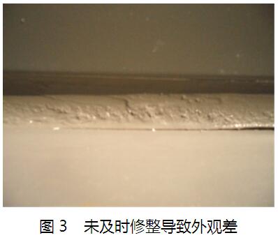 2) 注膠后未及時(shí)修整,時(shí)間間隔過長(zhǎng)。注膠后時(shí)間過長(zhǎng),膠表面已部分結(jié)皮半固化,這時(shí)再修整表面導(dǎo)致出現(xiàn)粒狀的膠皮。如圖3: