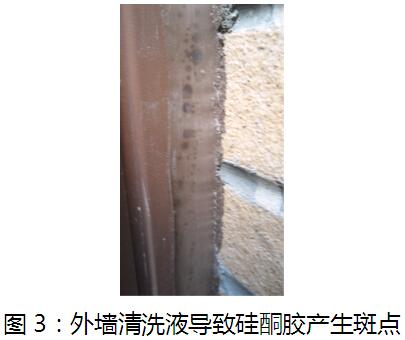 有機酸對硅酮密封膠外觀顏色有較明顯的影響,會引起密封膠表面變色。在施工工地現場,會用到外墻清洗液,這類物質屬于有機酸(草酸)的水溶液,會對硅酮膠表面產生影響,導致硅酮膠表面變色。如圖3: