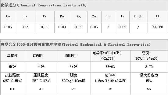 1060為純鋁中添加少量銅元素形成,具有極佳的成形加工特性、高耐腐蝕性、良好的焊接性和導電性。廣泛應用于對強度要求不高的產品,如化工儀器、薄板加工件、深拉或旋壓凹形器皿、焊接零件、熱交換器、鐘表面及盤面、銘牌、廚具、裝飾品、反光器具等。