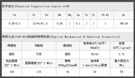 1100為純鋁中添加少量銅元素形成,具有極佳的成形加工特性、高耐腐蝕性、良好的焊接性和導(dǎo)電性。廣泛應(yīng)用于需要有良好的成形性和高抗蝕性,但強(qiáng)度要求不高的產(chǎn)品,如化工設(shè)備、食品工業(yè)裝置與貯存容器、炊具、壓力罐、薄板加工件、深拉或旋壓凹形器皿、焊接零件、熱交換器、鐘表面及盤面、銘牌、廚具、裝飾品、小五金件、反光器具等。