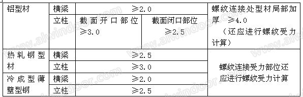 支承構件型材截面厚度是關系幕墻結構安全和材料用量的技術經濟綜合指標。根據鋼結構和鋁結構設計規范和工程經驗,《人造板材幕墻規范》作出下列表4規定: