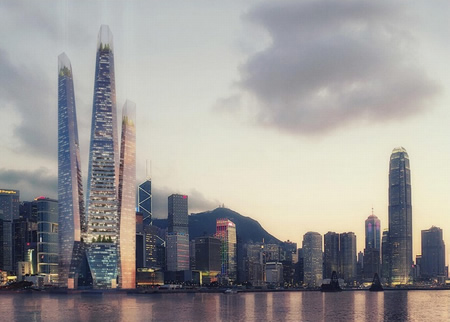英國工作室WestonWilliamson公布了三棟彼此連接一起的摩天樓方案,該項目地處香港,大樓位于維多利亞港的新高鐵線上方。建筑師對這棟高層綜合體的構想為一簇高達440m的高塔排列在景觀廣場上。 這三棟錐形輪廓的高塔,將在21層到25層之間彼此接觸。這與建筑師WestonWilliamson描述的“接吻”相呼應。三棟高塔建筑之間的“接吻”,創造了建筑內的主要公共空間。越過這一點,每棟高塔逐漸收縮,融入香港的天際線中。