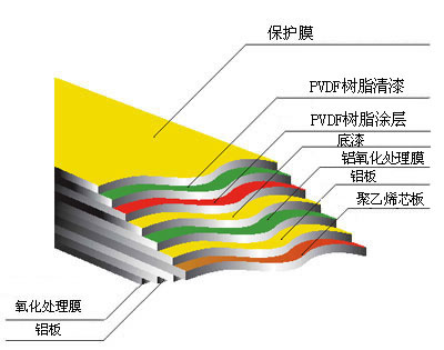 鋁塑復合板是由多層材料復合而成,上下層為高純度鋁合金板,中間為無毒低密度聚乙烯(PE)芯板,其正面還粘貼一層保護膜。對于室外,鋁塑板正面涂覆氟碳樹脂(PVDF)涂層,對于室內,其正面可采用非氟碳樹脂涂層。