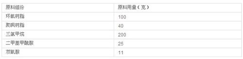 環氧聚砜膠是以環氧樹脂和聚砜樹脂為主要原料,配合以溶劑、固化劑等組成的,它主要用于粘接各種金屬結構件、各種刃具及其它工具等。該膠粘劑的特點是具有高的粘接強度、綜合性能好,但其耐水、耐濕熱性能稍差。 配方