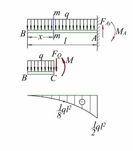 名稱 懸臂梁(cantilever) 概念 懸臂梁:梁的一端為不產生軸向、垂直位移和轉動的固定支座,另一端為自由端(可以產生平行于軸向和垂直于軸向的力)。 在工程力學受力分析中,比較典型的簡化模型。在實際工程分析中,大部分實際工程受力部件都可以簡化為懸臂梁。 設計方法 構件 混凝土懸臂構件:一般懸臂梁截面高度取懸挑長度的1/5。 配筋放大 一般設計院在最后出圖時還會把懸臂梁的配筋放大50%~100%。這是因為懸臂梁的魯棒性不夠的原因。 懸臂梁撓度的計算 懸臂梁設計中最重要的因素就是梁因為受力而引起的彎曲變形,即撓度,下表把各種懸臂梁的撓度計算公式一一列出: