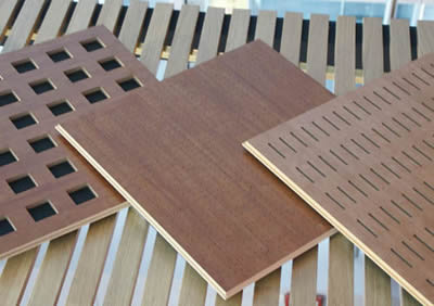 1分類 木質吸音板分槽木吸音板和孔木吸音板兩種,槽木吸音板是一種在密度板的正面開槽、背面穿孔的狹縫共振吸聲材料;孔木吸音板是一種在密度板的正面、背面都開圓孔的結構吸聲材料。兩種吸音板常用于墻面和天花裝飾。