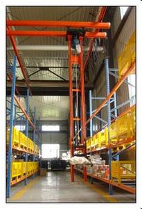 橋式堆垛機具有起重機和叉車的雙重結構特點,像起重機一樣,具有橋架和回轉小車。橋架在倉庫上方運行,回轉小車在橋架上運行。同時,橋式堆垛機具有叉車的結構特點,即具有固定式或可伸縮式的立柱,立柱上裝有貨叉或者其他取物裝置。貨架和倉庫頂棚之間需要有一定的空間,保證橋架的正常運行。立柱可以回轉,保證工作的靈活性。回轉小車根據需要可以來回運行,因此橋式堆垛機可以服務于多條巷道。橋式堆垛機的堆垛和取貨是通過取物裝置在立柱上運行實現的,因為立柱高度的限制,橋式堆垛機的作業高度不能太高,橋式堆垛機主要適用于12米以下中等跨度的倉庫,巷道的寬度較大,適于笨重和長大件物料的搬運和堆垛。 主要技術性能參數 (1)額定起重量 額定起重量是橋式堆垛機在正常使用的工況下,安全作業能夠允許叉起的最大物料的重量及取物裝置重量的總和,單位千克或噸。在選用橋式堆垛機時須考慮額定起重量,因為額定起重量選得過小,不能滿足裝卸作業的要求,過大則會造成基建投資的浪費。 (2)最大起升高度 最大起升高度指橋式堆垛機在額定起重量下,貨物起升到最高位置時,貨叉水平段的上表面到地面的垂直距離,單位為米。倉庫的高度決定著選用的橋式堆垛機的最大起升高度。 (3)工作速度 橋式堆垛機的工作速度主要指起升速度、回轉速度、小車運行速度以及整車運行速度,單位米/秒或米/分鐘。起升速度指取物裝置或物品上升(或下降)的速度,有快速、慢速以及微速之分。回轉速度是指回轉小車旋轉的速度,叉取的貨物越重,旋轉速度就要越慢。小車運行速度指小車在橋架上滑動的速度。整車運行速度指橋架在軌道上的運行速度。 (4)堆垛機貨叉的下撓度 堆垛機貨叉的下撓度指在額定起重量下,當貨叉上升到最大高度時,貨叉最前端彎下的距離。這個參數非常重要,它反映了貨叉抵抗變形的能力。撓度太大說明貨叉材質太軟,叉取貨物時極易滑落而出危險。 (5)生產效率 生產效率指橋式堆垛機在規定作業條件下,每小時堆垛或卸垛貨物的總質量,單位噸/小時。堆垛機的生產效率不僅取決于設備本身的性能參數,而且與貨物的種類、工作條件、操作熟練程度等有密切的關系。要提高堆垛機的生產效率,要從提高起重量、增加單位時間的工作循環次數、推行先進的生產作業組織方式以及提高操作熟練程度等方面人手。 其他補充 |